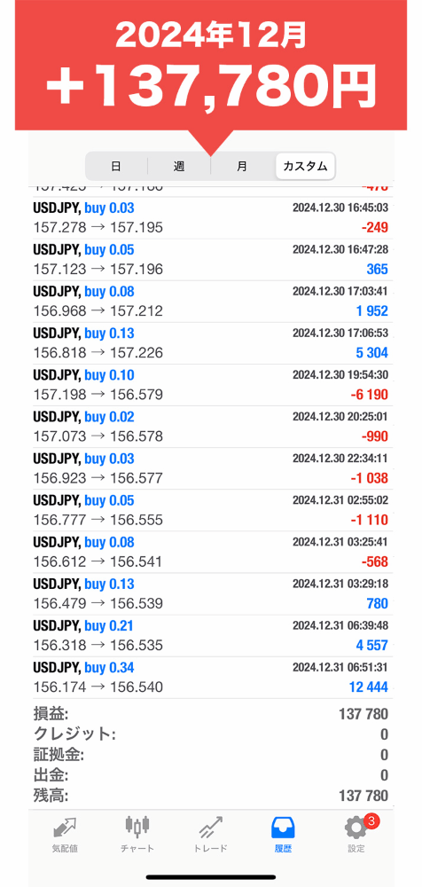テストを繰り返し、最適な設定を見出したことで、だんだん得られる利益も大きくなってきました。(もちろん安全ロットです)