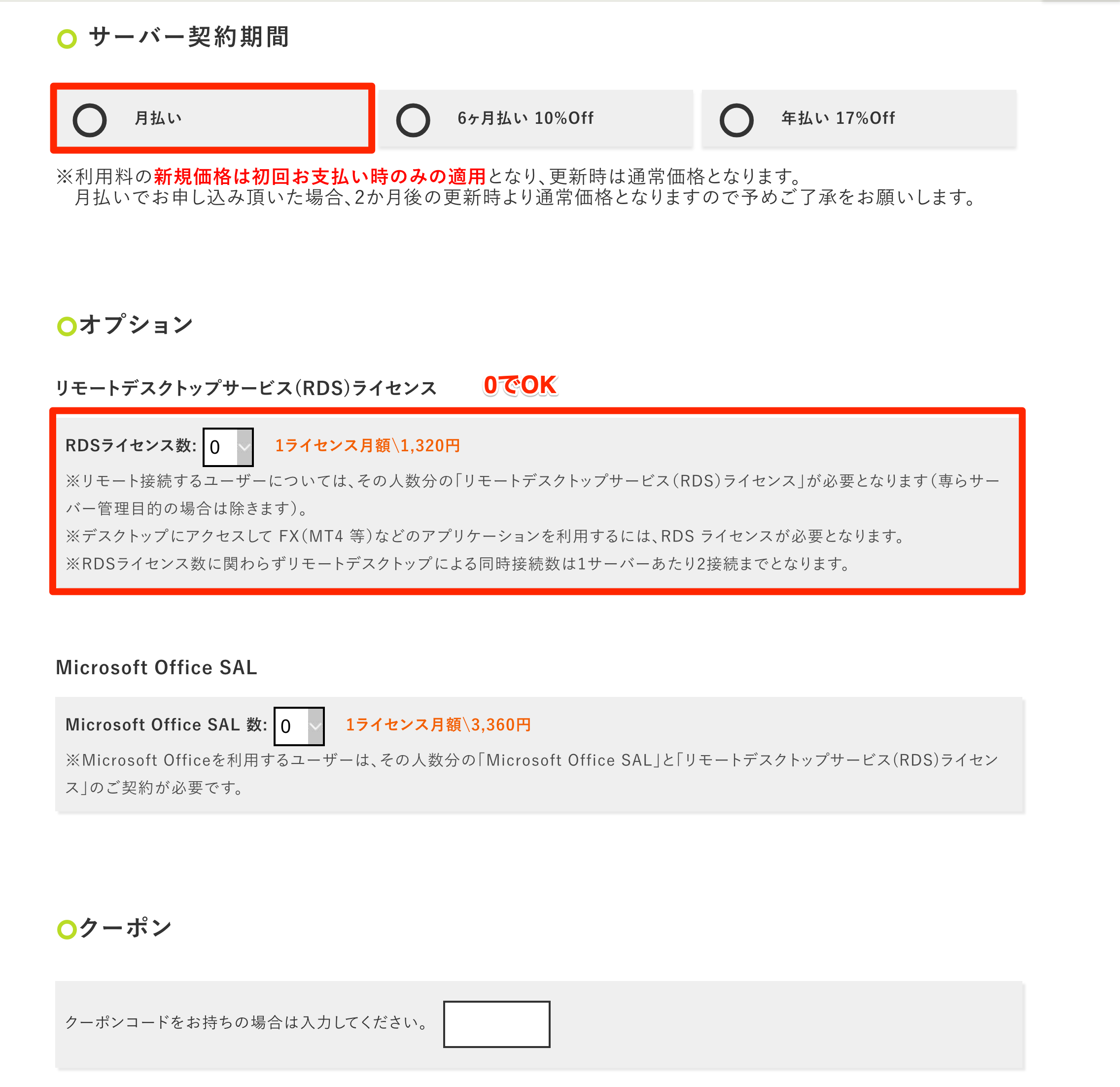 ※RDSライセンスは0で大丈夫です。